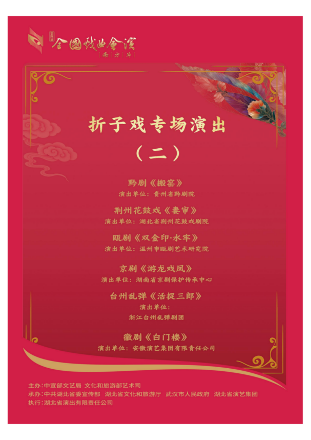 此次會演由中宣部文藝局,文化和旅游部藝術司主辦,中共湖北省委宣傳部,湖北省文化和旅游廳,武漢市人民政府,湖北省演藝集團承辦。匯聚了來自全國16個?。▍^、市)的17臺優秀保留劇目和12位青年演員主演的傳統經典折子戲,黔劇《搬窯》作為貴州地方戲曲的代表之一,將與其他優秀劇目一同為觀眾帶來一場戲曲盛宴。