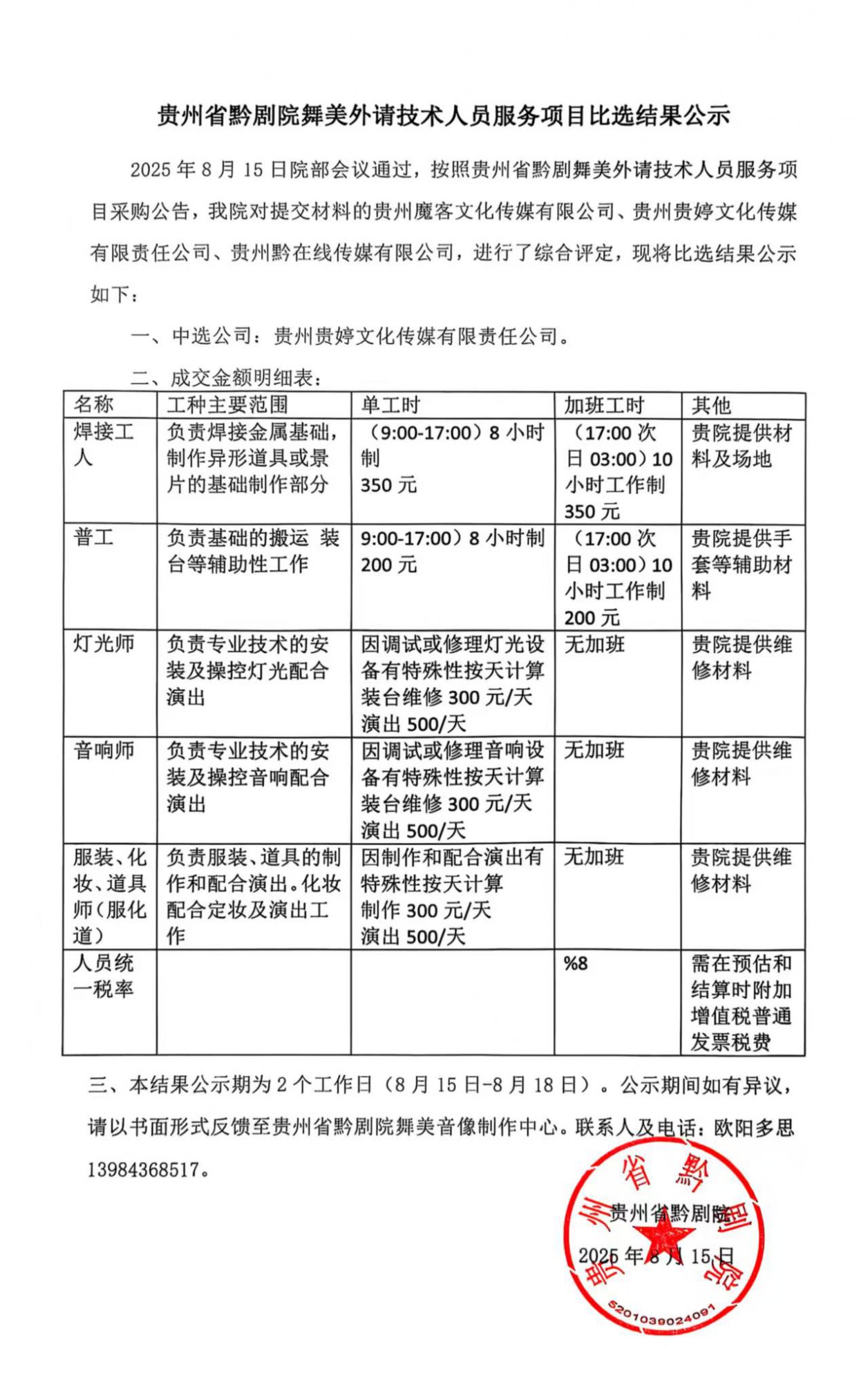 貴州省黔劇院舞美外請(qǐng)技術(shù)人員服務(wù)項(xiàng)目比選結(jié)果公示