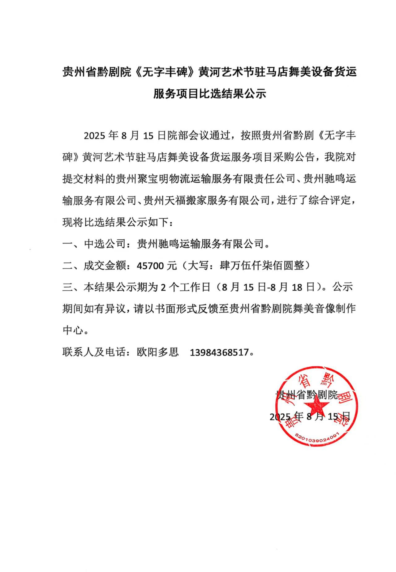貴州省黔劇院《無字豐碑》黃河藝術節駐馬店舞美設備貨運服務項目比選結果公示