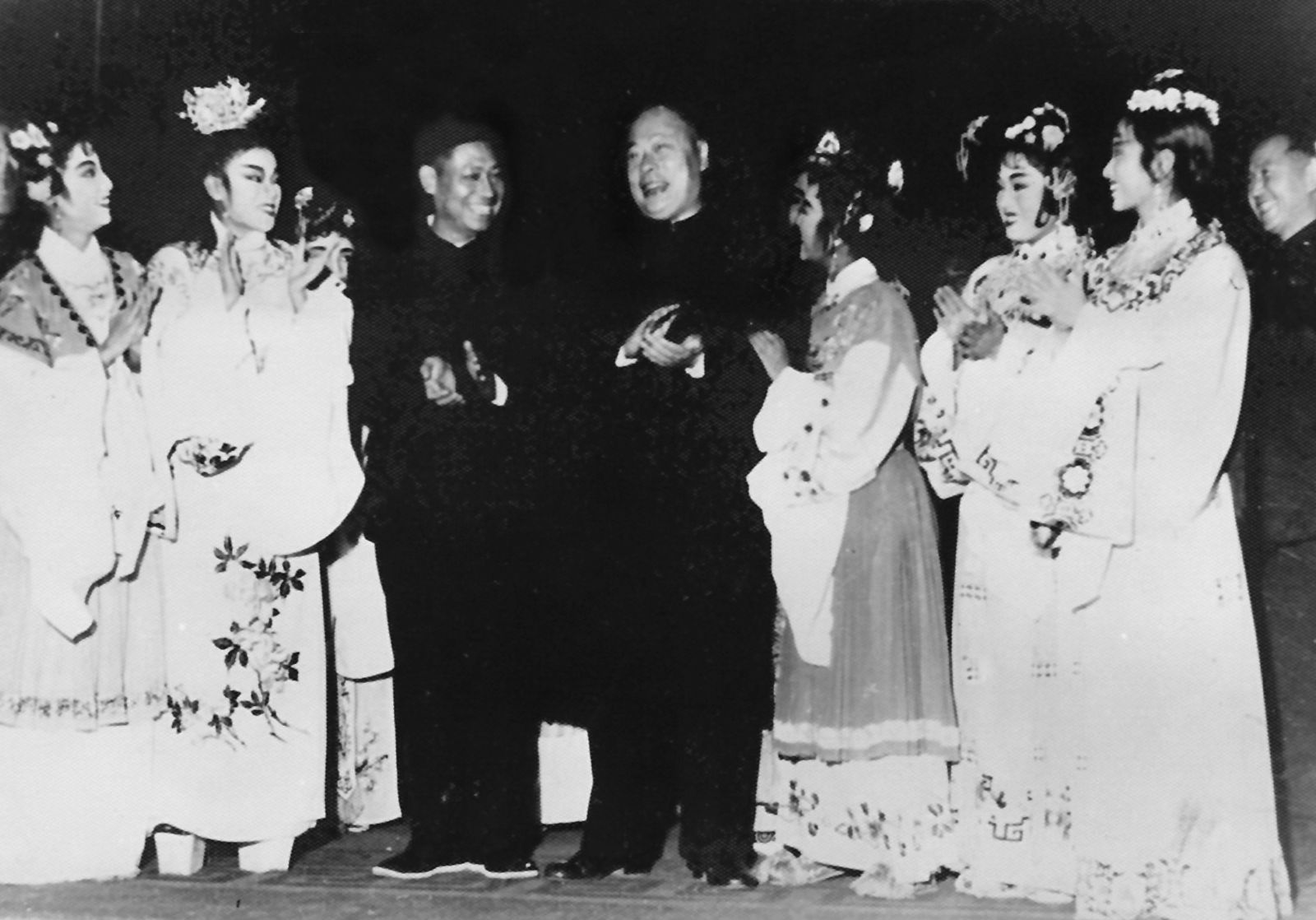 1960年5月2日,周恩來總理接見《卓文君·閨怨》、《西廂記·佳期拷紅》 全體演員并合影留念。 | 1960年6月24日,全國人大副委員長郭沫若、國務院副總理習仲勛接見《秦娘美》 演員并合影留念。 |
