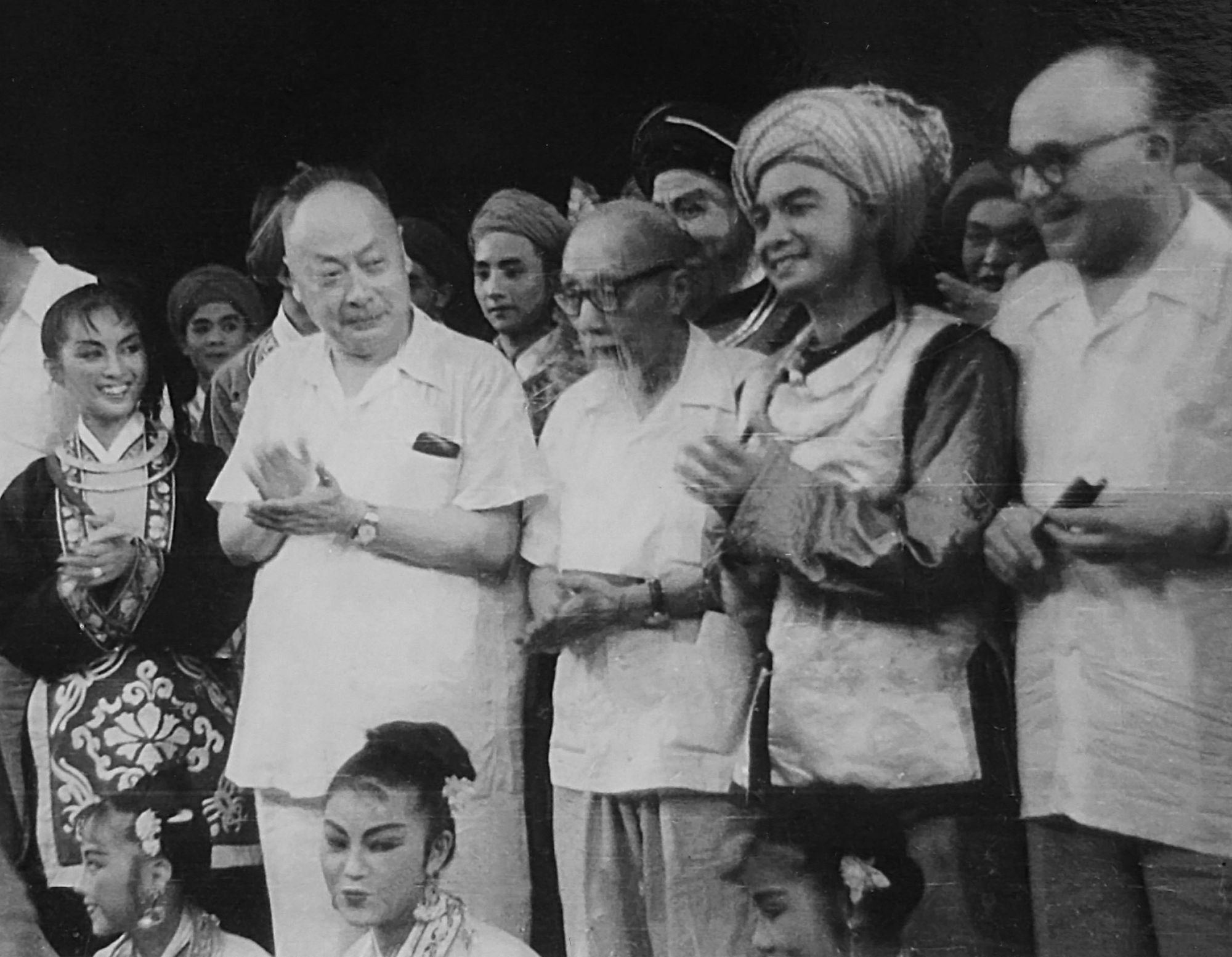 1960年,國務院副總理陳毅、周林省長接見《卓文君》、《紅樓夢》片段的演員, 并合影留念。 | 1960年7月1日,國務院副總理陳毅接見《秦娘美》演員并合影留念。 |